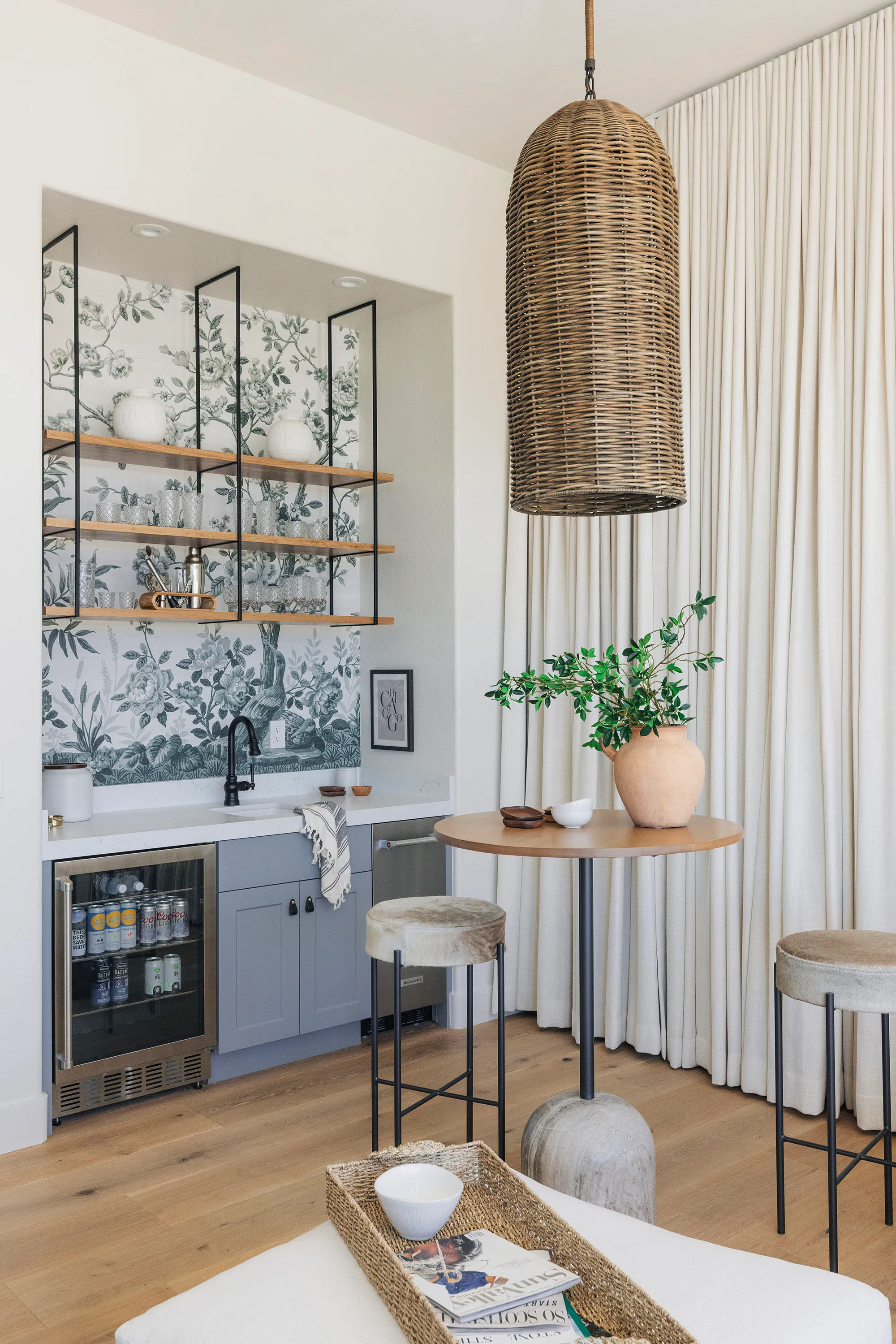 The most captivating detail is the vintage-style botanical wallpaper backing the open shelving. This touch of whimsy and depth transforms a functional storage area into a beautiful design feature, drawing you into the nook. This thoughtful space is also highly practical, housing an under-counter fridge for easy access to drinks for both kids and adults.