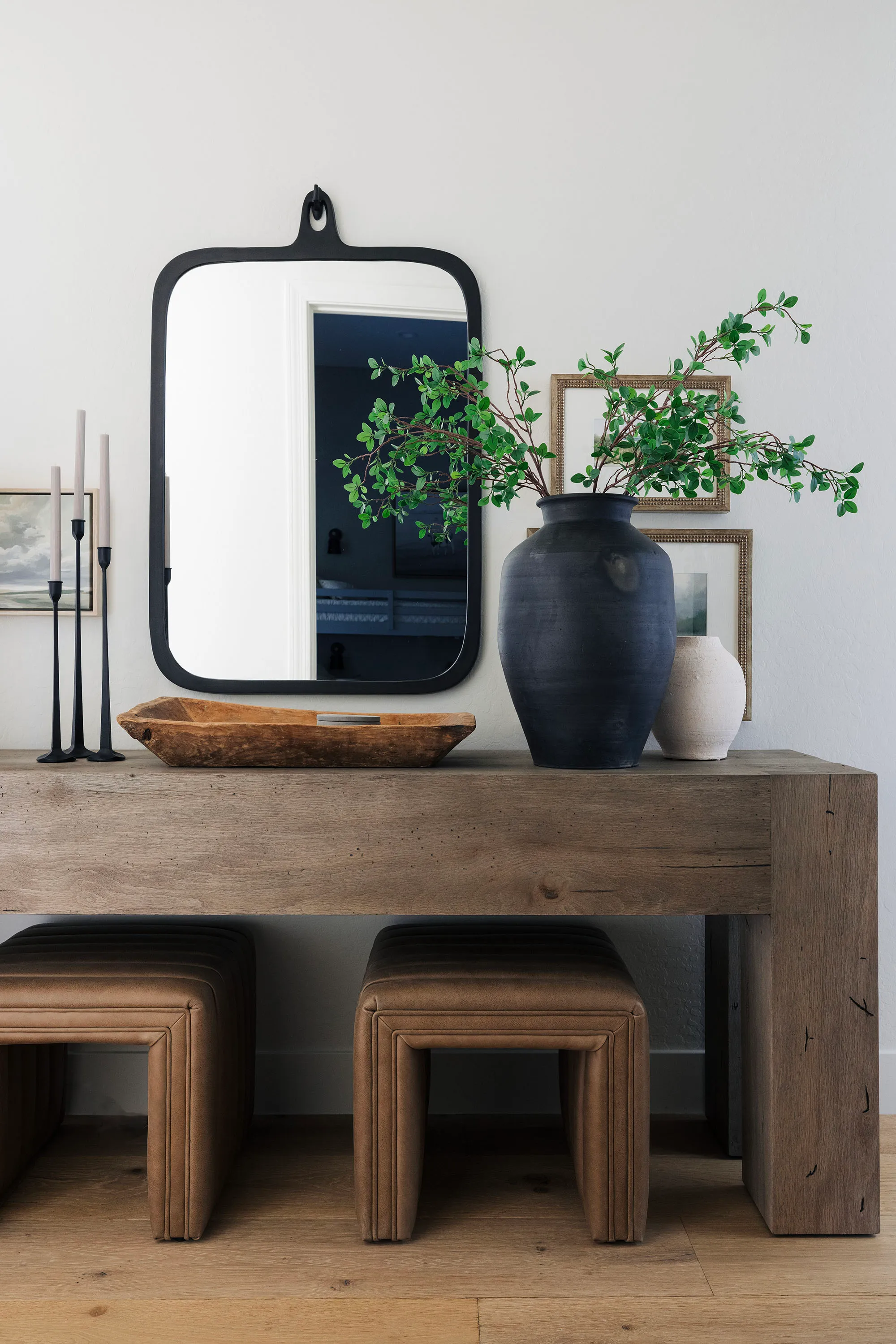 This airy backdrop is grounded with organic textures that add warmth and depth. The White Oak floors provide a rustic foundation, while the rich Cognac Leather of the dining chairs offers a tactile contrast. The feeling is "Earthy Minimalist," an interplay between the cool, smooth leather and the warm, rustic grain of the oak that is both curated and comfortable, proving that a family home can feel both lived-in and impeccably styled.