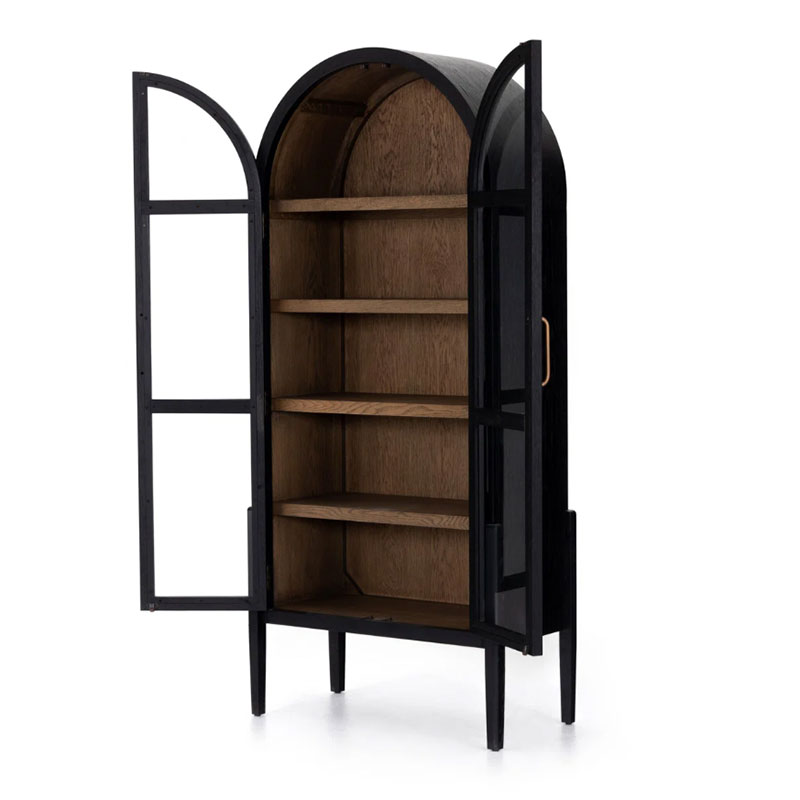 Subtle but critical safety features are also built in. Invisible magnetic locks on the lower bar cabinets keep the design sleek while ensuring the area is safe for all ages. Nearby, a tall, black arched display cabinet, with a finish reminiscent of Sherwin Williams "Iron Ore," draws the eye upward, creating a dramatic silhouette that balances the horizontal lines of the media console while keeping fragile decor safely out of reach.