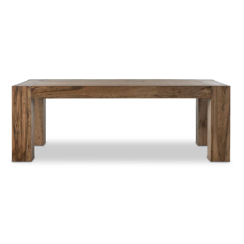 The massive, weathered wood dining table is a true "power table." Its durable surface resists scratches and heat from laptops, but its real genius lies in the integrated pop-up power grommets, hidden by the centerpiece, that eliminate the trip-hazard of extension cords.